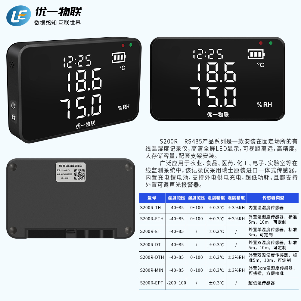 S200R RS485產(chǎn)品系列是一款安裝在固定場所的有線溫濕度記錄儀,高清全屏LED顯示,可視距離遠(yuǎn),高精度,大存儲容量,配套支架安裝。 廣泛應(yīng)用于農(nóng)業(yè)、食品、醫(yī)藥、化工、電子、實驗室等在線監(jiān)測系統(tǒng)中,該記錄儀采用瑞士原裝進(jìn)口一體式傳感器,內(nèi)置充電鋰電池,支持外電供電充電,超低功耗,且都支持外置可調(diào)聲光報警器。